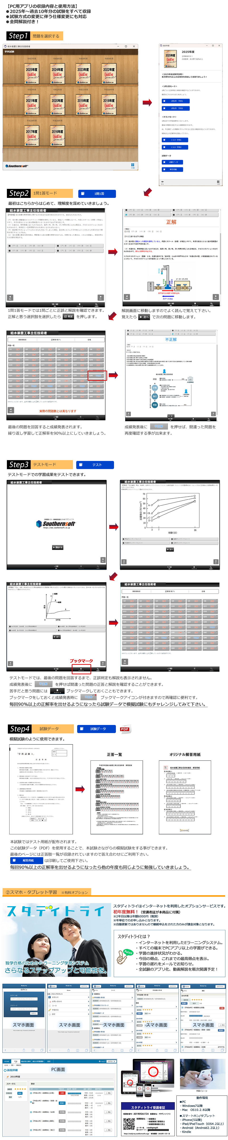 本商品は「給水装置工事主任技術者」試験合格を目指す方の為の画期的な学習システム! パソコンとスマホのダブル学習によりとても効率よく試験対策をすることができます。 ・参考書では収録しきれない大量のデータであなたの勉強をしっかりサポートします。 ・時間を作ることが難しい人でも隙間時間で効率よく質の高い勉強をすることができます。 ・毎年数多くの人に利用され、「合格者からの声」も毎年届く!それが「サザンソフトの学習セット」です。